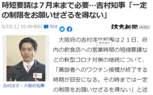 時短要請は7月末まで必要…吉村知事「一定の制限をお願いせざるを得ない」