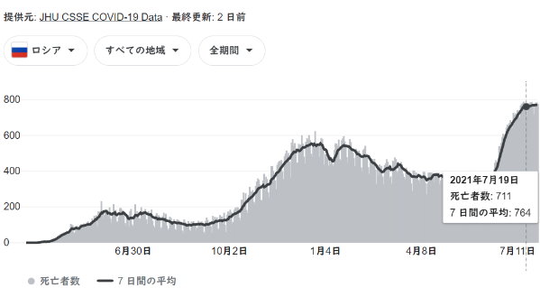 ロシアの感染は収まっておらず、というかメッチャ感染拡大で死者も1日700人ごえ!人口も日本と近い1奥千万人くらい。