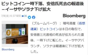 ビットコイン一時下落、安倍氏死去の報道後-イーサやソラナ下げ拡大