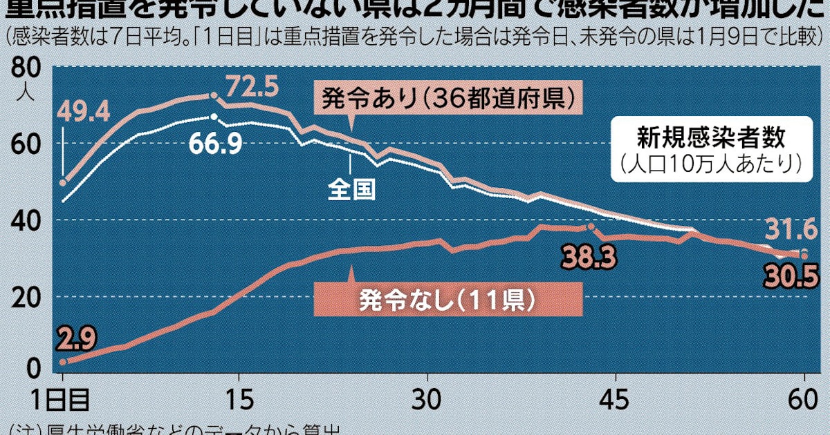 新型コロナウイルス対策の行動制限に意味はあるのか。1~3月の流行第6波では飲食店などを規制する「まん延防止等重点措置」を適用するかどうかで自治体の対応が割れた。発令した36都道府県のうち8県で60日目に感染者が多くなるなど地域差もある。