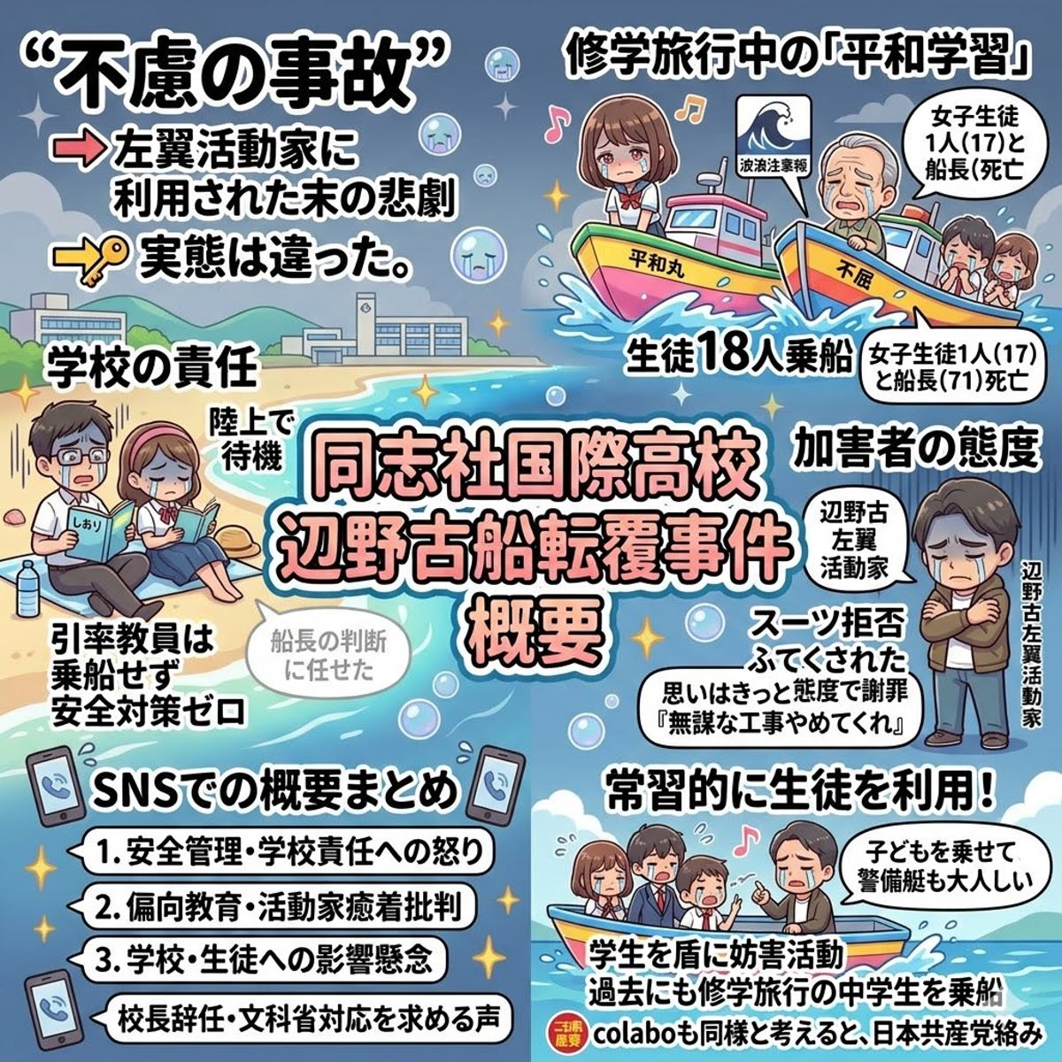 - 船が基地反対「抗議船」であり、普段から立ち入り禁止海域に突っ込む活動をしている動画が拡散され、「平和学習の名目で生徒を洗脳・利用した」「左翼活動家に資金提供・民泊斡旋か」との指摘が急増。