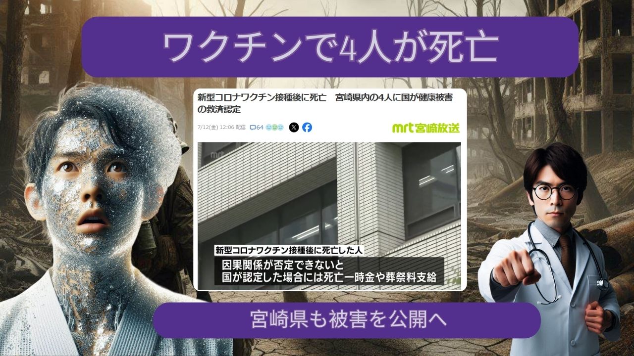 宮崎県からお知らせ ワクチンで4人が死亡したことが判明した。 国は、因果関係を否定できず、ワクチンによる健康被害が原因であるとみなされたため、健康被害の救済金を支払った。