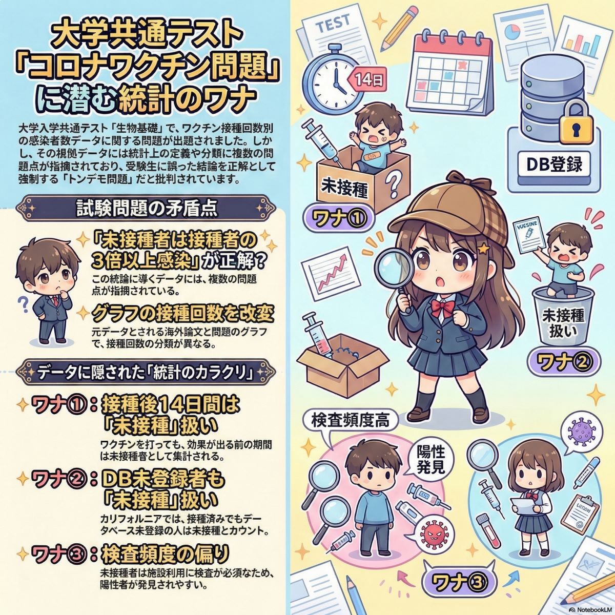 この大学入学共通テストが恐ろしいのは 「ワクチン未接種者は、2回目接種者の3倍以上感染した」 と答えないと、受験生は点数がもらえないところ。
