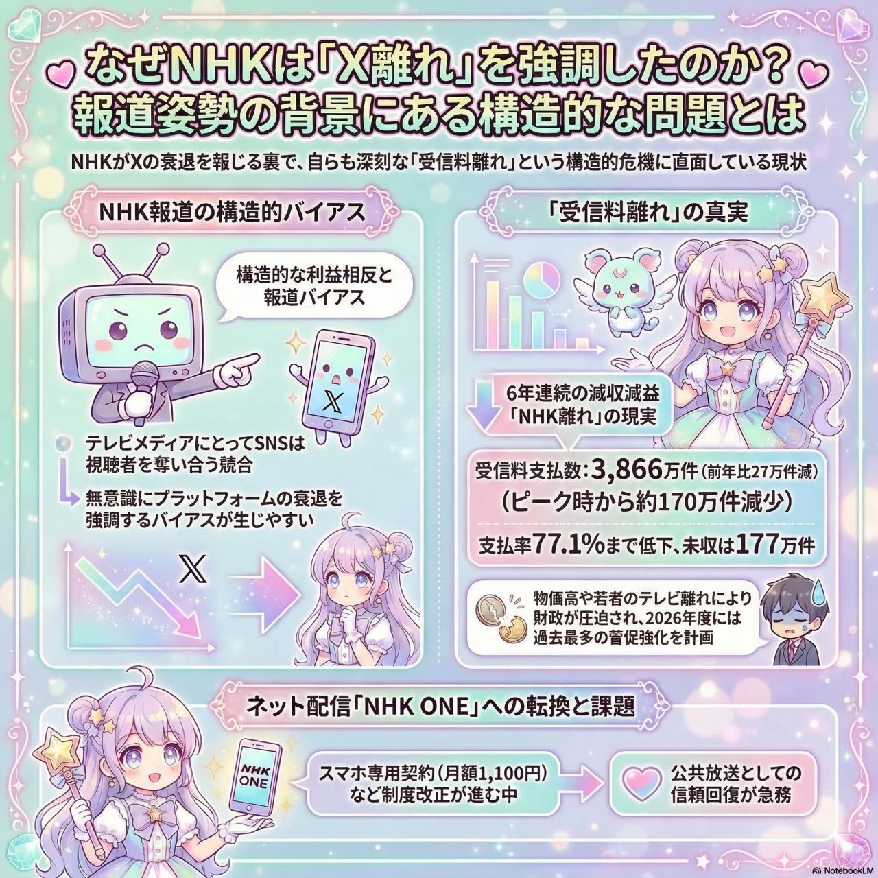 公共放送が自身の利害関係に近いテーマを扱う場合、透明性と自己検証がとりわけ重要になります。 報道姿勢の背景については、記事の「なぜNHKはX離れを強調したのか?」セクションで詳しく解説しています。