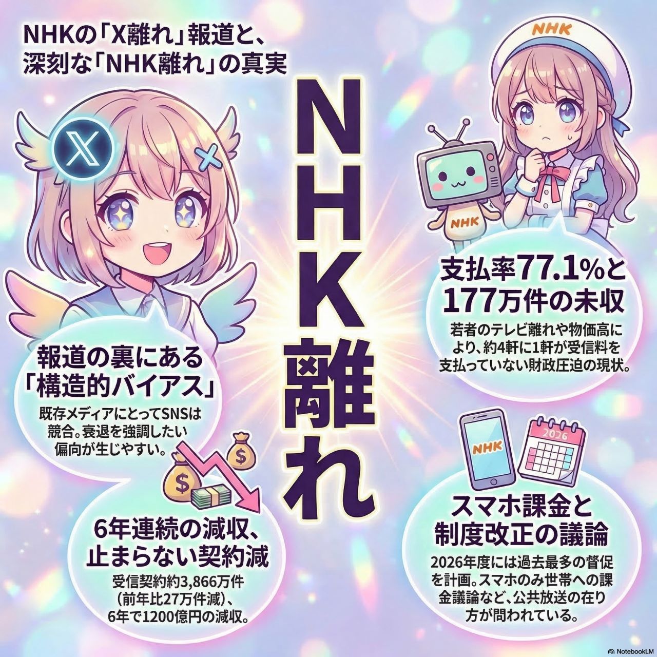 「X離れ」報道はその一例として注目を集めましたが、NHKの受信契約が6年連続で減少している背景には、物価高による家計の支出見直し、スマートフォン中心の情報消費への移行、そしてNetflixやYouTubeなどとの競合激化があります。 一つの報道問題が「NHK不信」の象徴として拡散されやすいのは、こうした積み重なった背景があるためです。