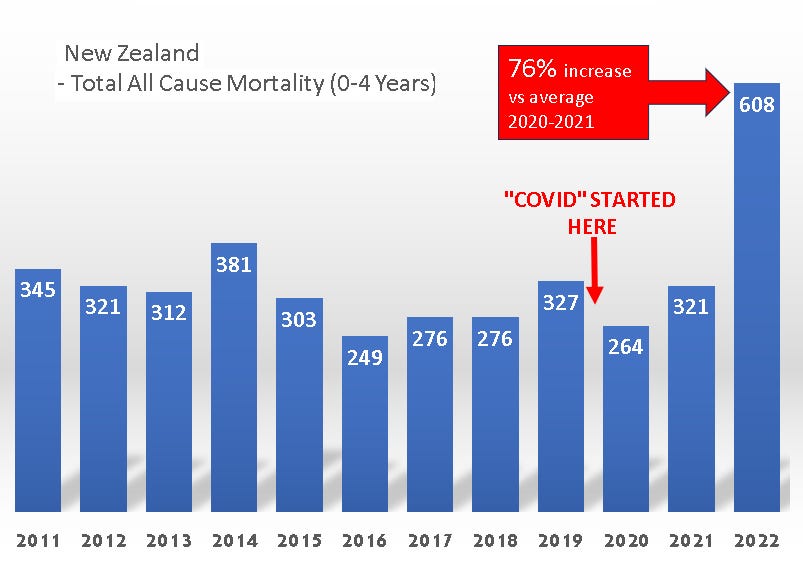 Deaths in New Zealand Ages 0-4 Leap by 76%, from average of 344 to 608 in 2022!