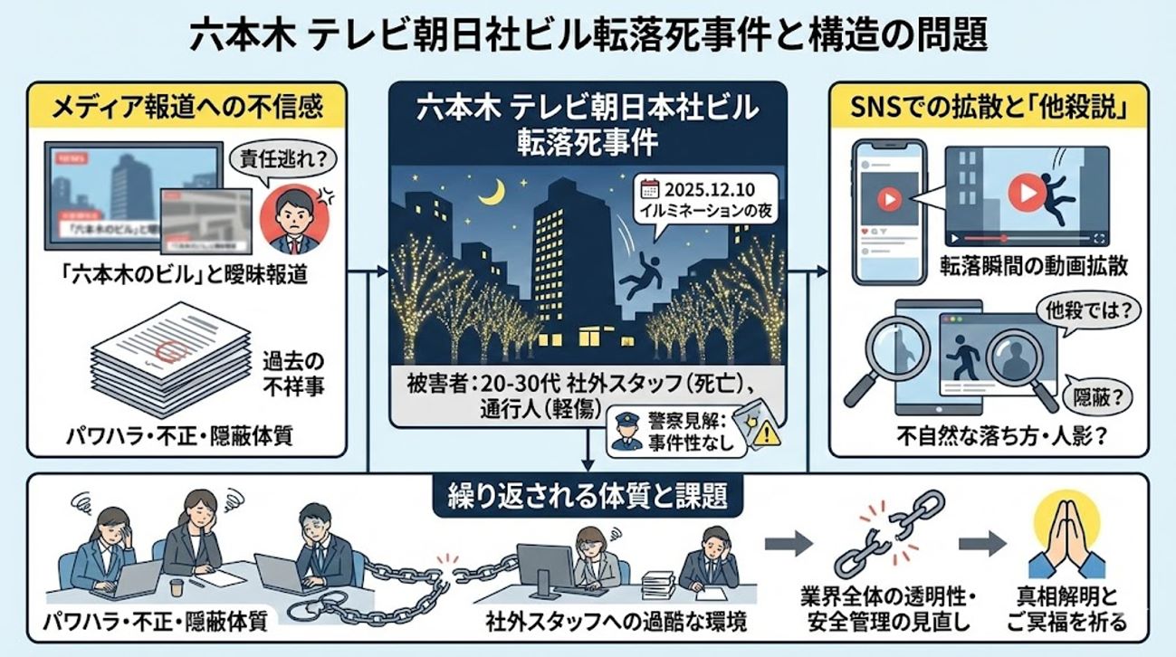 🕒 2025年12月10日午後6時50分頃、東京都港区六本木のテレビ朝日本社ビルから、20〜30代の社外スタッフの男性が転落し、その場で亡くなりました。