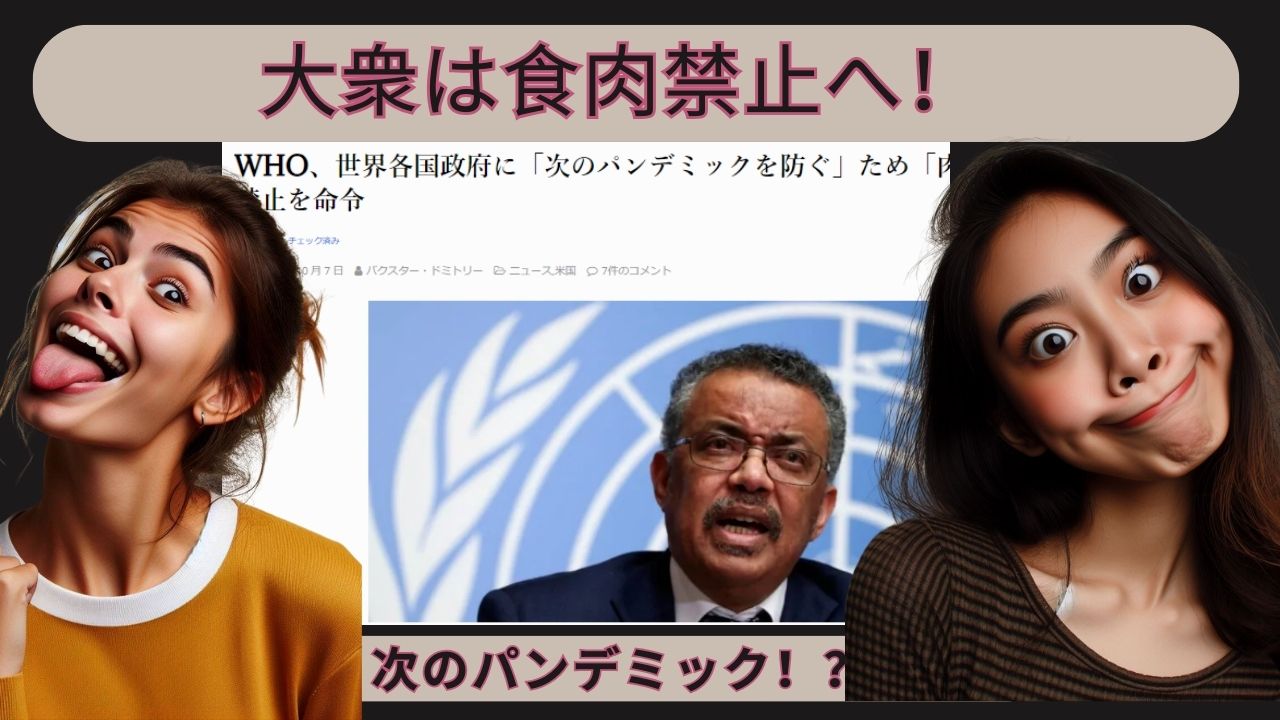 世界保健機関(WHO)は、「次のパンデミック(世界的大流行)」は食肉供給から起こると世界各国政府に警告した。 WHOによれば、食肉供給を規制し、一般庶民には手の届かない動物性食品の価格を設定し、多くの製品を全面的に禁止しなければならない。
